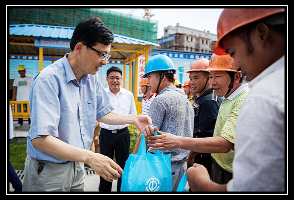 2016年7月22日下午14:30,吳興區(qū)區(qū)長吳智勇、吳興區(qū)政協(xié)主席潘華等一行領(lǐng)導親切慰問高溫下奮戰(zhàn)在湖州市愛山小學教育集團高新校區(qū)工程一線的施工人員,為他們送去防暑降溫用品。我公司集團董事局主席楊虎麟等領(lǐng)導陪同參加慰問。