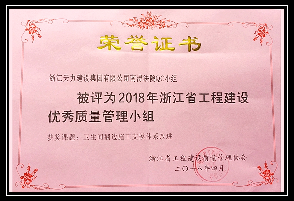 我公司南潯區(qū)人民法院新建審判用房QC小組被評(píng)為“2018年浙江省工程建設(shè)優(yōu)秀質(zhì)量管理小組”,獲獎(jiǎng)?wù)n題為《衛(wèi)生間翻邊施工支模體系改進(jìn)》。