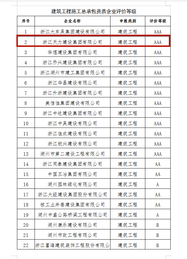 日前,根據《湖州市建筑施工企業信用評價辦法(試行)》(湖建發(2019)95號)等文件要求,集團公司從企業的資信狀況、經營素質、履約信譽等方面對公司進行了全面、客觀的分析和評價。最終,集團公司建筑工程施工總承包資質再次被湖州市建設局評定為2020年度企業信用評價“AAA”級企業。