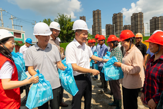 吳書記向大家送上防暑降溫慰問品,并對(duì)工人們不畏高溫、一如既往地堅(jiān)守崗位,為吳興區(qū)發(fā)展建設(shè)添磚加瓦表示感謝,吳書記語重心長(zhǎng)地叮囑大家要保重身體、注意安全。當(dāng)前正值高溫酷暑期間,施工單位在生產(chǎn)建設(shè)過程中一定要從科學(xué)發(fā)展、安全發(fā)展的高度,增強(qiáng)責(zé)任感,合理安排工時(shí),落實(shí)防暑降溫工作各項(xiàng)措施,避開高溫時(shí)段施工,時(shí)刻注意職工勞動(dòng)安全和身體健康,做到勞逸結(jié)合,確保夏季安全施工,在保障安全施工的同時(shí),保質(zhì)保量地完成各項(xiàng)任務(wù)。