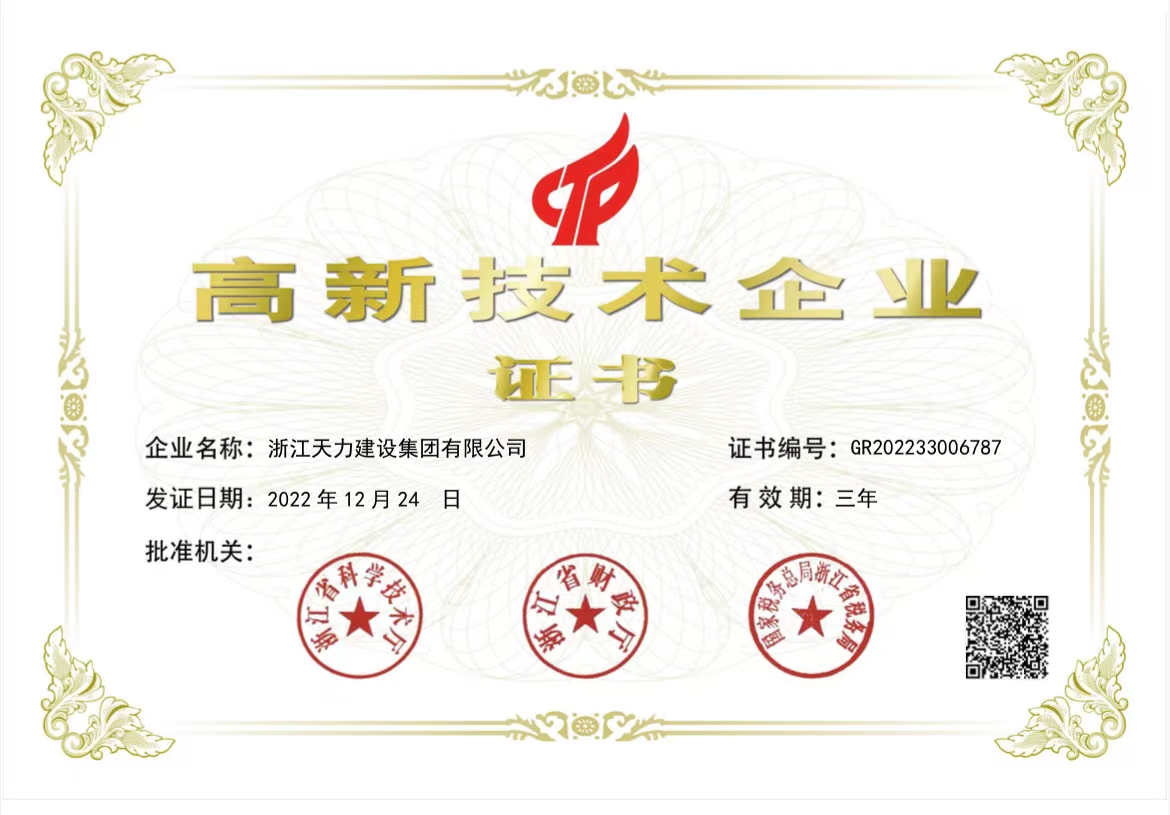 近日,浙江天力建設集團有限公司榮獲由浙江省科學技術廳、浙江省財政廳和國家稅務總局浙江省稅務局聯合頒發的“高新技術企業”認定證書,由此正式邁入國家高新技術企業行列。