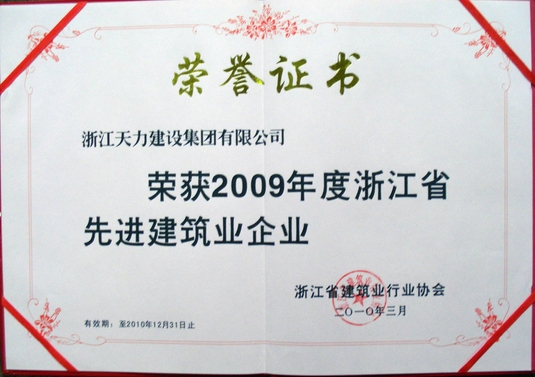 年度先進集體和個人。我公司被評為2009年度浙江省先進建筑業企業。